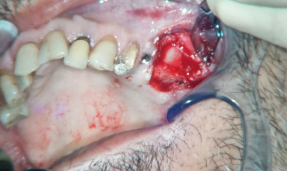 Fig. 9 Posizionamento di membrana in collagene a protezione dello sportello osseo.