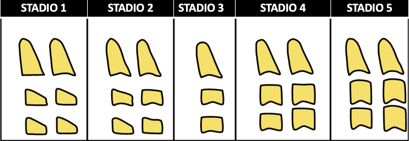 - CVMS 1: I margini inferiori delle vertebre sono piatti, con C3 e C4 di forma trapezoidale; il picco di crescita del soggetto avverrà all’incirca a due anni da questo stadio.